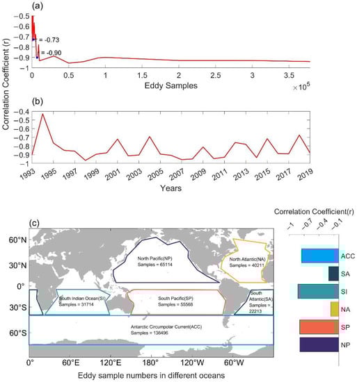 Variation of correlation coefficient between Egan and Ealpn curves with (a) eddy samples, (b) eddy occurrence years, and (c) ocean basins.
