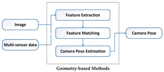 Geometry-based methods are classic solutions of vSLAM, which realize real-time positioning and mapping by restoring the mapping relationship between the camera’s geometric model and the photo [,]. Geometry-based methods are mainly divided into two categories: vision-only methods and vision-based multi-sensor fusion methods []. Vision-only methods only realize positioning through photos, and it is the first choice for autonomous positioning and environment perception without prior knowledge of the environment and external auxiliary information sources. Vision-based multi-sensor fusion methods achieve more accurate and robust vSLAM by combining vision cameras with other sensors, such as inertial navigation, sonar, depth meters, etc. The rest of this section will introduce geometry-based methods. Figure 1 is the pipeline of geometry-based methods and Figure 2 is an overview of SOTA geometry-based methods.