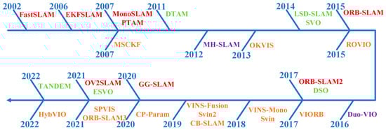 Overview of SOTA geometry-based methods. The ones above the timeline represent vision-only methods, with feature-based methods in red and direct methods in green. Those below the timeline represents vision-based multi-sensor fusion methods, where purple represents loosely-coupled and orange represents tightly-coupled.