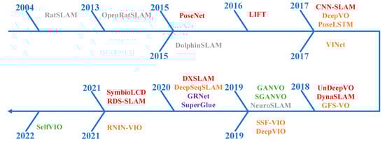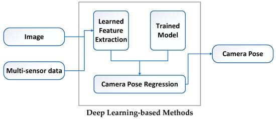 Deep Learning-based visual navigation and positioning technology has been highly expected in recent years. Different from relying on geometric models and mapping relationships to achieve navigation and positioning, deep learning-based methods provide a data-driven alternative. Deep learning-based methods can automatically discover task-relevant features using highly expressive neural networks, which also makes them better suited to more scenarios. Benefiting from the ever-increasing amount of data and computing power, these methods are rapidly advancing to a new stage [,]. At present, deep learning-based methods are mainly divided into two categories. One is to use deep learning to replace one or several modules in traditional vSLAM, such as feature extraction [], depth estimation [,], loop closure detection [], and so on. The second is to integrate semantic information into vSLAM to improve the positioning accuracy of vSLAM and build a semantic map []. The neural networks currently used in vSLAM can be mainly divided into convolutional neural networks (CNN), recurrent neural networks (RNN), generative adversarial networks (GAN), graph neural network (GNN), spiking neural network (SNN), and so on. Subsequent sections will introduce the application of these neural networks in navigation and positioning fields. Figure 3 is the pipeline of deep learning-based methods and Figure 4 is an overview of SOTA deep learning-based methods.
