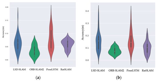 Figure 6 is the comparison chart of the positioning accuracy of the four algorithms. For each algorithm, the corresponding graph is the fitted graph of the distribution of its positioning results at different levels of accuracy. The white dots indicate the average positioning accuracy, the black line indicates the accuracy distribution range, and the width of the graph indicates the number of positioning results at this level of accuracy. It can be seen from the figure that ORB-SLAM2 shows excellent positioning performance in terms of the highest accuracy, the lowest accuracy and the average accuracy, and its positioning accuracy on two sequences is concentrated between 0.02–0.07 m and 0.04–0.13 m, respectively. The positioning accuracy of RatSLAM is second, and its positioning accuracy is concentrated between 0.03–0.08 m and 0.02–0.21 m. The positioning results of LSD-SLAM are slightly better than that of PoseLSTM, but the results of both have a large deviation from the real results. However, it is worth noting that during the operation of the dataset, ORB-SLAM2 suffered some short-term tracking loss, and it is easy to fail in positioning in the case of sudden movement and overexposure.
