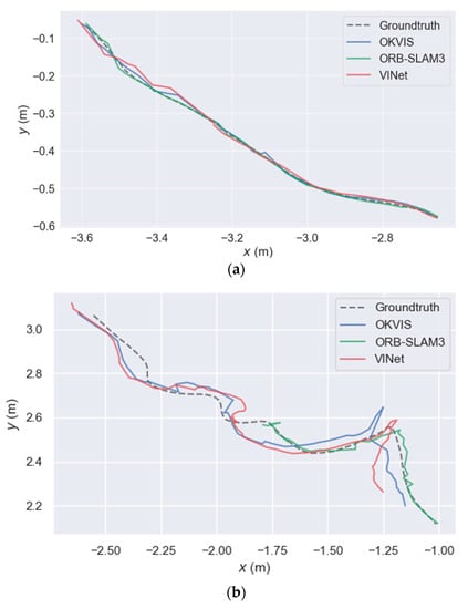Trajectory comparison of vision–inertial methods. (a) Sequence 1. (b) Sequence 7.