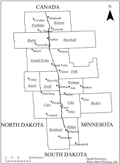 Location of NDAWN stations in counties of ND and MN around the RRVN.