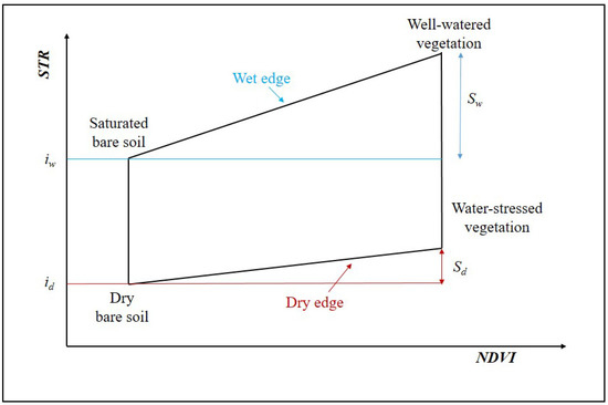 The STR-NDVI space forms a trapezoid shape based on the assumption of a linear relationship between soil- and vegetation-water contents. Therefore, the parameters for Equation (3) can be obtained for a specific location in the satellite scene from the dry and wet edges of the optical trapezoid.