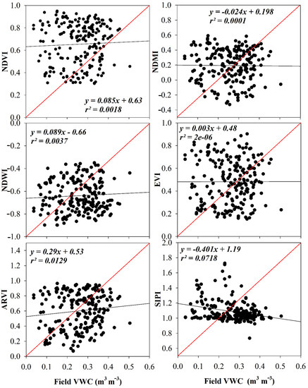 Scatter plot showing observed field VWC (m3 m−3) versus moisture-related indices (NDVI, NDMI, NDWI, EVI, ARVI, SIPI) for 2019 growing season in the RRVN using Landsat 8 images along with regression coefficient (r2) and linear equation.