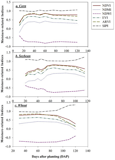 Early in the growing season, there was some bare ground on the corn and soybean fields, but the wheat field was quickly covered with greenness after emergence. This can be observed in the NDMI values (Figure 5), where early stages in the corn and soybean crops showed negative values; however, there were positive values in the wheat fields. In the NDMI values, variation was observed until the full canopy was observed in all crops, and not much change was observed afterwards. Unlike the NDVI and NDMI, the values are less for NDWI, and approaches −1 when the crop is at peak vegetative growth. A similar trend to NDVI was also observed with EVI and ARVI for all crops and days after planting. SIPI for all crops did not change much with growth stages because it is based on the leaf area index, chlorophyll, and carotenoid content. The values for each crop are different, but changes within the crop growth stages are minimal.