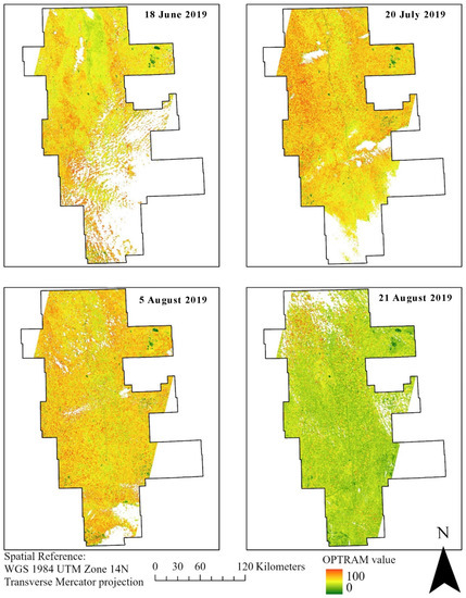 The weak relationship between the OPTRAM model’s estimated SM and the actual field surface SM may have been partly due to high values of SRT coupled with low NDVI in the peak vegetative stage. This can occur when there is water in excess of saturated SM. The soils in the RRVN are derived from an ancient glaciolacustrine lakebed with high clay content and poor internal drainage, and are prone to flooding. Water in excess of the saturated SM will cause an increase in STR while the actual SM cannot increase beyond the saturated SM content [28,54].