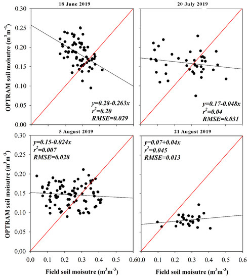 Similar results were observed by Babaeian et al. [35] across the diverse climate of the United States, where r2 ranges from 0.01 to 0.49 and RMSE ranges from 5–8%. They used the OPTRAM model to estimate SM in Arizona, California, and Georgia, and found a nearly trapezoidal shape by STR-NDVI points. They observed that distributions of STR-NDVI points differ with the area under study due to the characteristics of climate and land cover. Yadav et al. [36] also used the OPTRAM model to predict SM in the Lalitpur district of India and found that the accuracy of this model was less than 10% when compared with other models (thermal). However, Yadav et al. [36] concluded that this reduced accuracy might be due to the lack of penetration of optical bands in the fully or densely covered vegetation. Similarly, Chen et al. [37] evaluated OPTRAM-based SM estimates using MODIS data, providing an overall RMSE from 0.05 to 0.13 m3 m−3, and r2 from 0.10 to 0.50, respectively, which corroborates our results. The poor performance shown by the OPTRAM SM estimates related to in situ SM might be due to the rough image resolution and heterogeneous terrains [37].