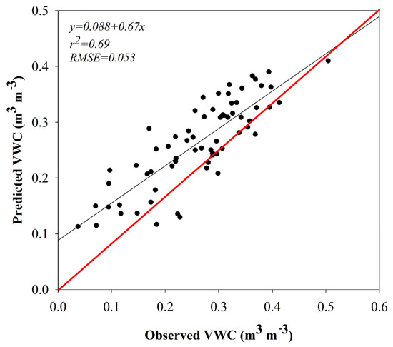 Scatter plot showing observed versus predicted volumetric water content (m3 m−3) during the testing phase along with regression coefficient (r2) and root mean square error (RMSE) for random forest regression model.