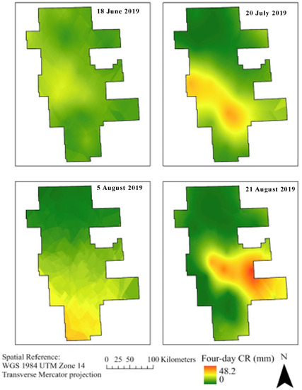 Each pixel value of SPI, four-day cumulative rainfall, percent clay, and OPTRAM SM among the selected areas of the agricultural fields in Cass County, ND were used to demonstrate mapping of the algorithm’s surface SM (Figure 12). The surface SM for all four dates range from 0.22 to 0.39 m3 m−3. The surface SM values on 18 June and 21 August were less compared to 20 July and 3 August.