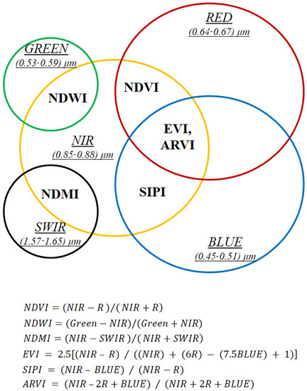 Radiometric corrections of the multispectral bands were performed using the Fast Line-of-sight Atmospheric Analysis of Spectral Hypercube (FLAASH) toolbox, included in the Environment for Visualizing Image (ENVI) 5.5 software (https://www.harrisgeospatial.com/, accessed on 1 January 2020). The FLAASH atmospheric correction algorithm was chosen due to its better performance compared to algorithms, such as Quick Atmospheric Correction (QUAC) and Dark Object Subtraction (DOS) [46]. After removing clouds and obtaining the atmospheric corrected bands, a variety of moisture-related indices were calculated for each pixel, as described below.