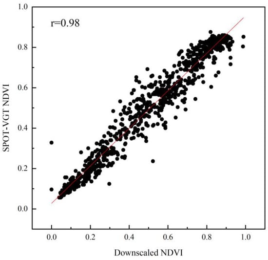 A total of 1000 pixels were randomly selected to compare the downscaled data and the SPOT-VGT NDVI in 1999 (Figure 3). The correlation coefficient was 0.98, indicating that the downscaled NDVI data were reliable.