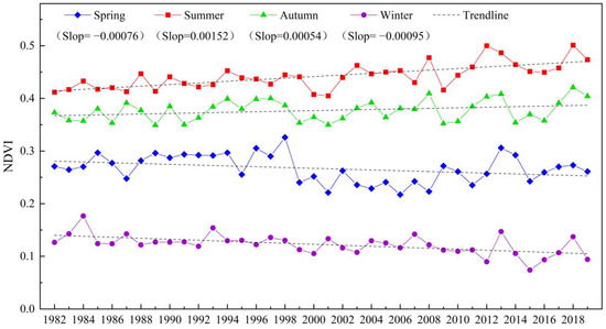 Change trend of NDVI in four seasons over time. The slopes of trend lines in spring, summer, autumn, and winter are −0.00076, 0.00152, 0.00054, and −0.00095, respectively (p < 0.05).
