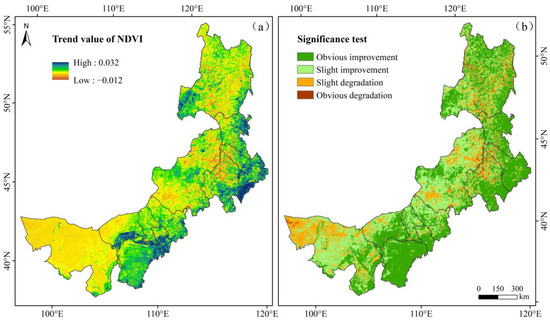 Change trends and significance tests of the annual NDVI in space in Inner Mongolia. (a) shows the 38-year NDVI change trend values in Inner Mongolia calculated by Theil–Sen median trend analysis. Values greater than 0 represent vegetation improvement, and values less than 0 represent vegetation degradation. (b) are the results from superposition of the Theil–Sen trend analysis and the Mann–Kendall test, showing the significance of vegetation change trends.