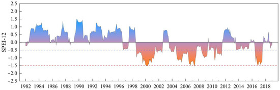SPEI-12 fluctuations in Inner Mongolia. The gradient color block represents the change of SPEI-12. Blue indicates wetting and orange indicates aridity. The blue dotted line indicates an SPEI value of −0.5, which is the boundary between drought conditions and non-drought conditions. The red dotted line indicates severe drought.