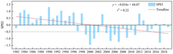 The maximum SPEI was 1.3 in 1990, and the minimum was −1.45 in 2000 (Figure 10). In 2000, the total precipitation was 239.4 mm, and the average temperature was 3.7. This was the driest year from 1982 to 2019. The annual SPEI showed a declining–fluctuating trend, and the rate was −0.034 per year, meaning that the study area became increasingly arid. A drought event occurred in 1999, followed by droughts from 2000 to 2002, from 2004 to 2007, and in 2009, 2011, and 2017. The drought frequency was approximately 29%.