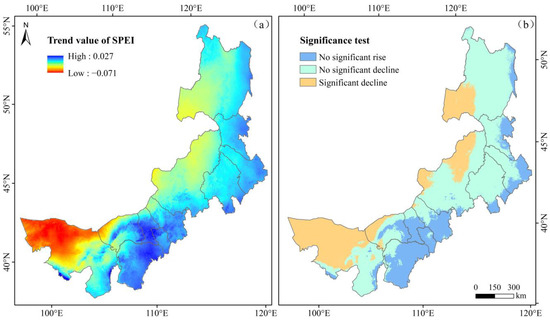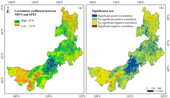 The correlation and corresponding significance between NDVI and SPEI in Inner Mongolia. (a) shows the correlation coefficient between NDVI and SPEI for 38 years in Inner Mongolia using Pearson correlation analysis. (b) are the results from the superposition of the correlation coefficient and t test showing the significance of the correlation between vegetation and drought.