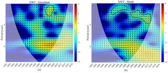 Wavelet analysis is an effective tool for obtaining the time–frequency characteristics, including the periodic, correlation, and hysteresis characteristics, of two time series in the fields of meteorology, hydrology, and astronomy [47,48]. With the help of Python programming language, XWT and WTC, components of the wavelet analysis method, were used herein to identify the correlation and lag characteristics between the NDVI and SPEI sequences.