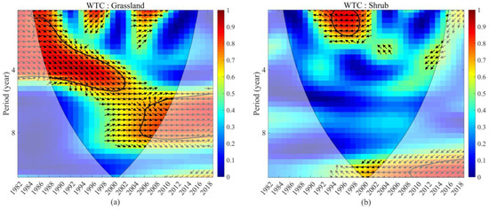 The results of Pearson correlation analysis in Section 4.4.1 showed a correlation between NDVI and SPEI, but large differences between different vegetation types were found. Therefore, XWT and WTC were used to further explore the response relationships between different types of vegetation changes and drought.