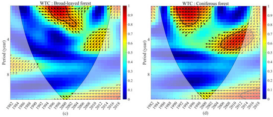 WTC condensation spectrum results of SPEI and NDVI of grasslands (a), shrubs (b), broad-leaved forests (c), and coniferous forests (d). The meanings of the colors, lines, and areas are the same as those in Figure 13.