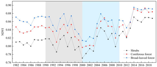 NDVI change trends of three forestlands in eastern Inner Mongolia. The gray highlights the period of excessive logging in the Daxinganling Mountains in the 1990s, and the blue highlights the construction period of the first stage of the natural forest protection project.