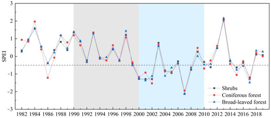 SPEI change trends of three forestlands in eastern Inner Mongolia. The meanings of the gray and blue backgrounds are the same as those in Figure 15. The black dotted line is the threshold for drought occurrence.