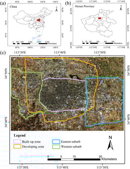 Study area. (a) Location of Henan Province in China; (b) Location of the study area in Henan Province; (c) Sentinel-2 remote sensing image of Zhengzhou (22 February 2018) and delineation of the eastern/western suburbs and developing/built-up zones.
