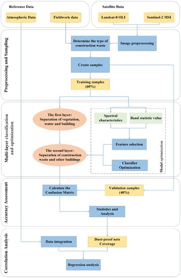 This paper proposed a multi-layer classification method to detect different types of construction waste. Satellite data covering Zhengzhou were processed, and the sample collection was constructed based on the spectral and geometric features of construction waste by visual interpretation. The multi-layer classification was built using two machine learning algorithms. The features and classifier were optimized by adjusting the principles and parameters for the second layer of the method. The identification method was evaluated by the classification accuracy calculated by the confusion matrix. The technical flow chart for construction waste monitoring and dust-proof nets effectiveness verification developed in this study is shown in Figure 3, which mainly includes preprocessing and sampling, multi-layer classification, accuracy assessment and correlation analysis with air quality.