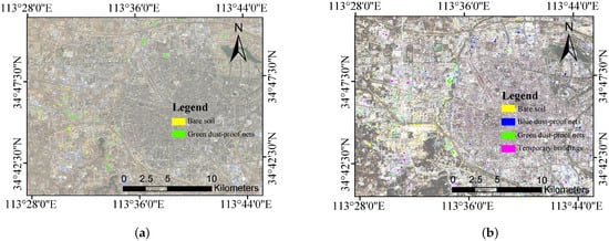 Two subsets of construction waste samples from western Zhengzhou in Sentinel-2 images. (a) The yellow and green parts represent bare soil and dust-proof nets, respectively (22 February 2018); (b) The yellow, blue, green and purple parts represent bare soil, blue dust-proof nets, green dust-proof nets and temporary buildings, respectively (7 July 2019).