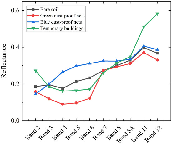 The spectral characteristic curve can visualize the separability of ground objects, which is a common manner of selecting features. The Spectral Response Functions (SRF) of samples on Sentinel-2 images in 2019 are shown in Figure 6. The curves of temporary buildings are completely different from construction waste, which peaks at Band 12. Band 2 was selected as a classified feature because the two kinds of dust-proof nets have similar trends in curves, except for this band. The difference between the response values of the four types at Band 6 is the largest, which means that the separability is good. Similarly, analyzing the Landsat-8 images led us to determine that Bands 3 and 4 are useful classified features.