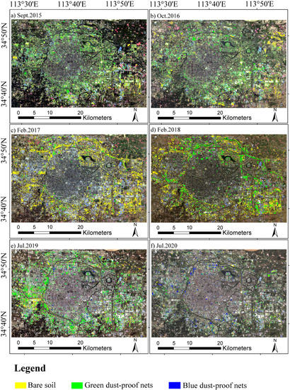 In order to improve the atmospheric environment, it is recommended to cover all bare soil and construction waste with dust-proof nets to reduce dust pollution, which is a precursor of haze [18,19]. In addition to effectively reducing dust, monitoring the dust-proof nets’ coverage of construction waste can also help urban waste supervision and environmental protection. However, the studies on solid waste based on remote sensing mainly focus on exposed construction waste, while there is still a big gap in the research of dust-proof nets. Meanwhile, most of the studies have focused on identifying construction waste from a particular landfill site or a small area, and limited research has been published globally on the change of construction waste in the spatial distribution pattern at the urban scale.