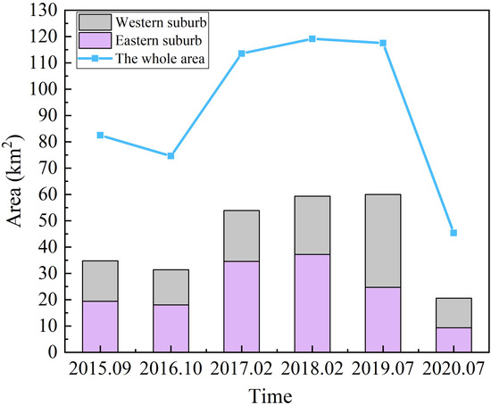 It is known that Zhengzhou City has been carrying out new urbanization planning since 2013, and, in 2017, it rapidly increased both in speed and scale. By 2020, the reform has achieved a milestone, and the speed of construction has slowed down. Our results, the variations of construction waste, are in line with the pace of urban construction mentioned above. In 2015–2016, urbanization was slow, and the area of construction waste was less compared to the later period. In 2017, the city entered a period of rapid change, with regions vigorously carrying out construction and demolition operations, leading to the emergence of many construction sites and a surge in construction waste. This state continued until 2019 when the rapid urbanization phase came to an end. Meanwhile, the coverage rate of dust-proof nets has increased in Zhengzhou due to the enhanced measures in construction waste management since 2017, which has promoted the improvement of the city’s air quality. By 2020, most operations were completed, and the area of construction waste has thus significantly reduced, falling back to a low level.