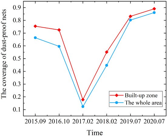 The coverage of dust-proof nets in the built-up zone and the whole area from 2015 to 2020.