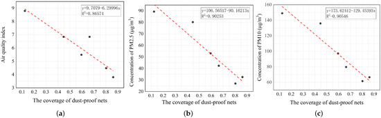 The linear regression models of (a) air quality index, (b) concentration of PM2.5, (c) concentration of PM10 and the dust-proof net’s coverage. The dashed lines denote the best-fit lines from linear regression.