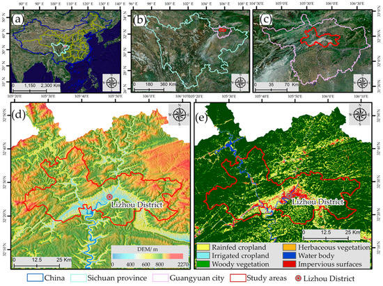 (a) The location of the study areas in China; (b) the location of the study areas in Sichuan provinces; (c) the location of the study areas in Guangyuan city; (d) NASA SRTM digital elevation 30 m; (e) reclass map of GLC_FCS30 in 2020.