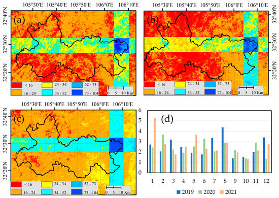 The numbers of cloudless pixels of Sentinel-2 image in the study area from 2019 to 2021. (a–c) The numbers of cloudless pixels in 2019 to 2021, respectively. (d) The monthly numbers of cloudless pixels from 2019 to 2021.