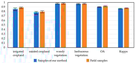 The accuracies of annual land-cover maps were quantified from 2019 to 2021. Firstly, the classification result was validated using the samples obtained by our method. The result showed that the overall accuracies ranged from 0.895 to 0.902, with the kappa ranged from 0.851 to 0.862. The F1 scores of irrigated cropland, rainfed cropland, woody vegetation, and herbaceous vegetation ranged from 0.836 to 0.879, 0.759 to 0.8, 0.964 to 0.981, and 0.958 to 0.978, respectively. Then, some field samples were selected to validate the classification results. The results show that the overall accuracy and kappa accuracy ranged from 0.902 to 0.921 and from 0.87 to 0.895, respectively. The F1 score of irrigated cropland, rainfed cropland, woody vegetation, and herbaceous vegetation ranged from 0.863 to 0.902, from 0.781 to 0.813, from 0.971 to 0.990, and from 0.961 to 0.980, respectively (Figure 6). By comparing the classification accuracy of the samples obtained using our method with field samples, the results showed good agreement, thus affirming the reliability of our method in terms of classification accuracy.