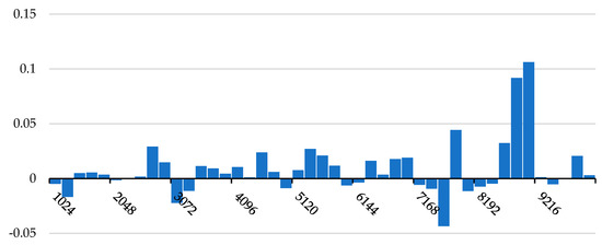 From the point of view of different sampling points (Figure 6), the accuracy values of the tree species classification for the experiments using original data did not vary much. When the number of individual tree sample points was 8192, the difference between the classification accuracy values of the experiments using original data and wood data was relatively large. Figure 6 shows the difference (original vs. wood) in the classification accuracy of tree species in the 45 sets of comparative experiments using original data and wood data. The maximum value of the difference was 0.1063, the absolute value of the difference was greater than 0.01 in 21 groups of experiments, and the absolute value of the difference was less than 0.005 in 15 groups of experiments.