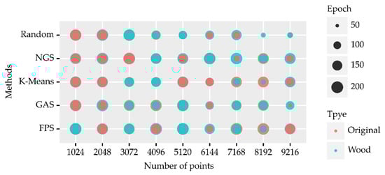 We recorded the experimental results with the highest accuracy after processing original data and wood data separately for each sampling method (Figure 10). The NGS method requires more sampling points to achieve the maximum classification accuracy, while the two downsampling methods, K-means and random, required few points.