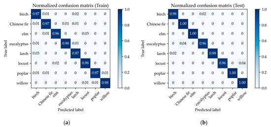 Confusion matrix for tree species classification of (a) training data and (b) test data.