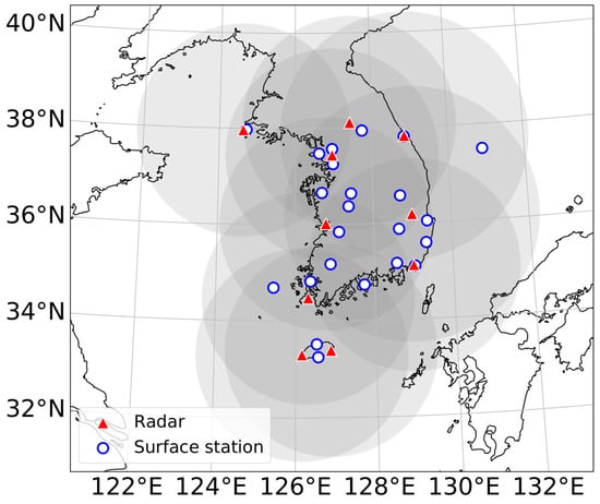 Dual-polarization radar networks (red triangle) with ~240 km range from each radar (gray shading) and surface station for present weather observation (blue open circle).