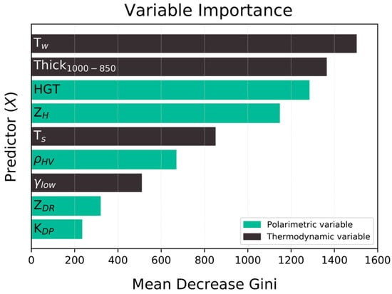 The importance of the predictors (mean decrease Gini) with importance decreasing from top to bottom. Polarimetric variables are in green and thermodynamic variables are in gray.