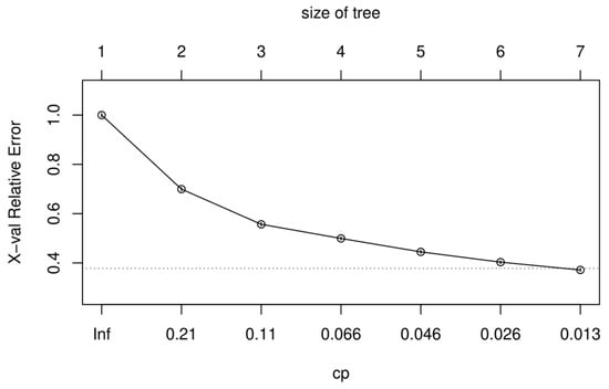 DT can be optimized by reducing the depth of trees through pruning. The pruning reduces the complexity of the DT, improving the prediction accuracy by removing the overfitted subtrees. We conducted pruning using the argument called complexity parameter (cp) in the “rpart” package [50] in R software. It is based on the cost-complexity algorithm to find the optimal depth of the tree [45]. The optimal size of trees is typically chosen when cp is near 0.01. If the value is smaller than 0.01, DT tends to be complicated and overfit. The size of the tree (and corresponding cp value) is displayed in Figure 4 with the 10-fold cross-validation error (i.e., X-val relative error). The DT was appropriately pruned by choosing seven leaves to be the size of the tree.
