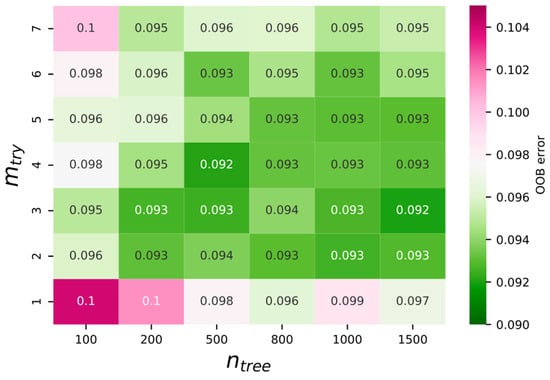 RF has two hyperparameters: the number of trees (ntree) and the number of predictors (mtry). Predictors are randomly sampled in each DT. Liaw and Wiener [49] suggested ntree of 500 and mtry of as the default value for a classification problem, where p is the total number of predictors. The default value of mtry is 3 () since p is 7 in this study. To determine the optimal values of mtry and ntree, we calculated the out-of-bag error (OOB error) by varying the mtry from 1 to 7 and ntree from 100 to 1500 (Figure 5). The local minimum of OOB error (0.092) was found at mtry of 4 and ntree of 500. The OOB error decreased from about 0.098 to 0.092 until mtry was 4 when ntree was 500 then tended to increase with increasing mtry. The global minimum appeared at ntree of 1500 and mtry of 3, but time efficiency must be considered given the similar OOB error but longer computational time compared to ntree of 500. Therefore, we selected mtry of 4 and ntree of 500 as optimal values.