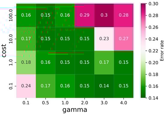 The 10-fold cross-validation error rate of the SVM model under the different cost and gamma. The value in each tile indicates the error rate.