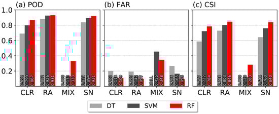 For all precipitation types, the RF had the best score, followed by the SVM and the DT. The RF presented a POD of higher than 0.9 and a CSI of higher than 0.8 for both RA and SN. The RF also showed a better skill in the classification of MIX, as shown by the CSI of ~0.3, which is definitely higher than that of SVM (0.120).