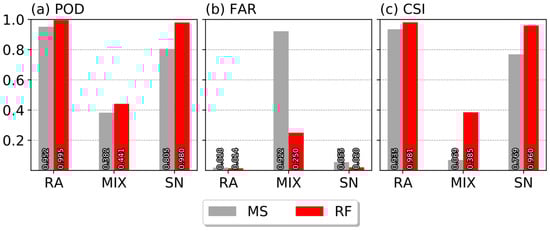 As shown in Figure 8, the RF outperformed the optimized Matsuo scheme in the overall statistics. Both methods presented good performance in RA and SN. In particular, the PODs of the RF for RA and SN were almost equal to 1. In the MIX case, the RF showed a POD, FAR, and CSI of 0.441, 0.250, and 0.385, respectively. Although MIX is the most challenging type to predict, the RF reduced FAR by 0.742 (from 0.922 to 0.250) and increased CSI by 0.316 (from 0.069 to 0.385) compared to the optimized Matsuo scheme.