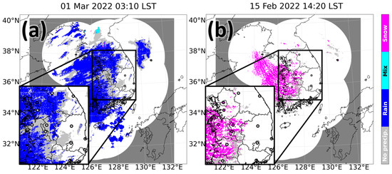 Examples of RF classification in (a) rain-dominant case (0310 LST, 1 March 2022) and (b) snow-dominant (1420 LST, 15 February 2022). The circle filled with color indicates the ground truth. The insets in (a,b) are zoom-in-boxes, providing a clear view of the classification.