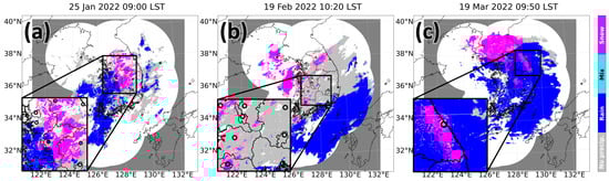 Same as Figure 9 except for cases of the co-occurrence of multiple precipitation types at (a) 0900 LST, 25 January 2022, (b) 1020 LST, 19 February 2022, and (c) 0950 LST, 19 March 2022.