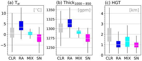 Similarly, the distribution of Thick1000–850, which reflects the mean temperature of the layer [12,15], showed strong dependence on the precipitation type (Figure 11b). Analogous to Tw, except for CLR, Thick1000–850 was also distributed in different ranges of values according to the precipitation type so that they did not overlap with each other. This result indicates that both Tw and Thick1000–850 were the key factors for discriminating the precipitation types.